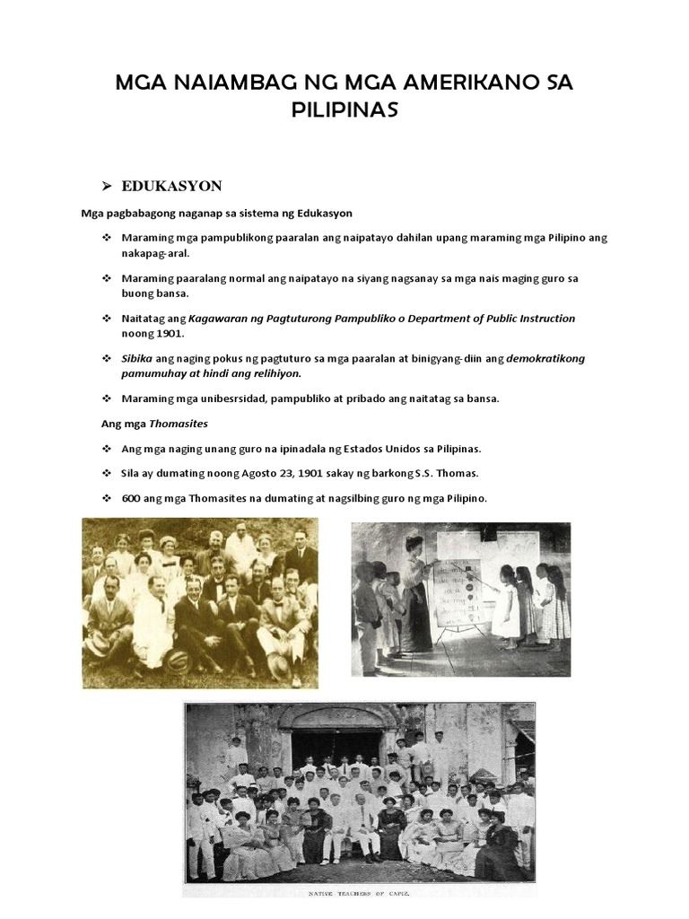 1041 Agosto bilang buwan ng Wikang Filipino 2001 -Revision ng Ortografiyang Filipino at Patnubay sa ispeling ng Wikang Filipino. MGA NAIAMBAG NG MGA AMERIKANO SA PILIPINAS EDUKASYON Mga pagbabagong naganap sa sistema ng Edukasyon Maraming mga pampublikong paaralan ang naipatayo dahilan upang maraming mga Pilipino ang nakapag-aral. Naitatag ang Kagawaran ng Pagtuturong Pampubliko o Department of Public Instruction noong.