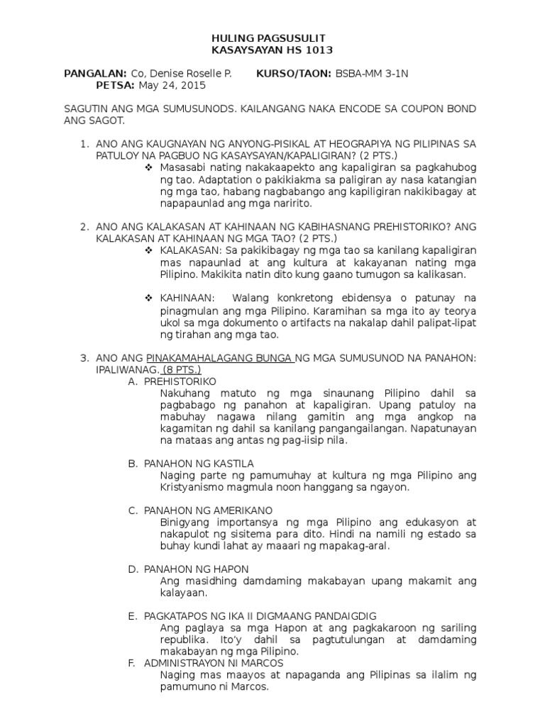Huling Pagsusulit Kasaysayan Hs 1013 Pangalan Co Denise Roselle P Kurso Taon Bsba Mm 3 1n Petsa May 24 2015