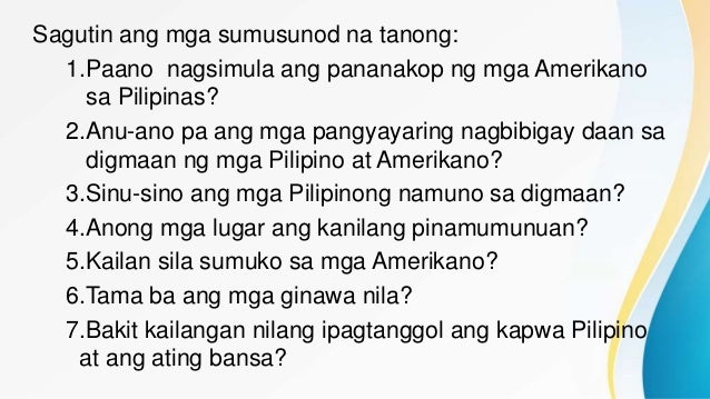 5Kailan sila sumuko sa mga Amerikano. 1Paano nagsimula ang pananakop ng mga Amerikano sa Pilipinas. Hindi pagbibigay ng mga buwis ng Pilipino sa mga Amerikano.
